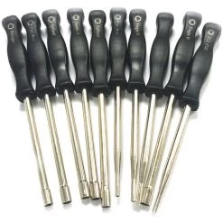 Dieses Kit ermoglicht es Ihnen, auf einfache Weise die Vergaser einstellen und den Motor in gutem Zustand zu halten. Die Art von Werkzeug ist fur eine einfache Identifizierung auf den Griff markiert.