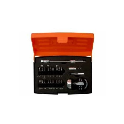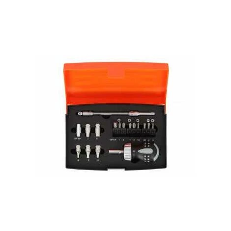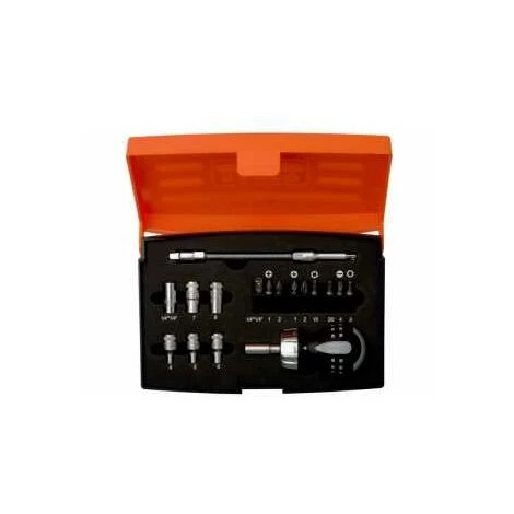 1/4 Bit-Ratschenschraubendreher, kurze Ausführung, Bithalter, Bits und Steckschlüssel-Einsätze im SatzLeichte und handliche Einsatzbox mit abgerundeten EckenAustauschbare Vierkantklinge808050S-18 1 Stk Ratschenschraubendreher, kurze Ausführung mit austauschbarer Klinge8 Stk S2 Zink-Phosphat Bits: PH1, PH2, PZ1, PZ2, T-15, T-20, SL 4, HEX 31 Stk 1/4 x 1/4 Einsteckadapter1 Stk 1/4 4-Kant x 1/4 Sechskant-Bithalter 50 mm1 Stk Ratschenschraubendreher, kurze Ausführung mit austauschbarer Klinge1 Stk 1/4 4-Kant x 1/4 4-Kant einstellbarer Einsteckadapter 150 mm1 Stk 1/4 x 1/4 Bit-Adapter5 Stk 1/4 Einsätze: 4, 5, 6, 7, 8 mm808050S-1817 Stk S2 Zink-Phosphat Bits: PH1, PH2, PH3, PZ1, PZ2, T10, T15, T20, T25, T27, T30, T40, SL 4, SL 5, SL 5.5, SL 6.5, SL 1/41 Stk 1/4 x 1/4 Einsteckadapter1 Stk 1/4 4-Kant x 1/4 Sechskant-Bithalter 50 mm1 Stk 1/4 4-Kant x 1/4 4-Kant einstellbarer Einsteckadapter 150 mm1 Stk 1/4 x 1/4 Bit-Adapter | Eigenschaften: Höhe: 46 mm, Länge: 195 mm, Gewicht: 530 g, Breite: 130 mm, Package Dimension: 46 x 130 x 195 mm, Anzahl der Teile: 18, VDE-geprüft: Nein