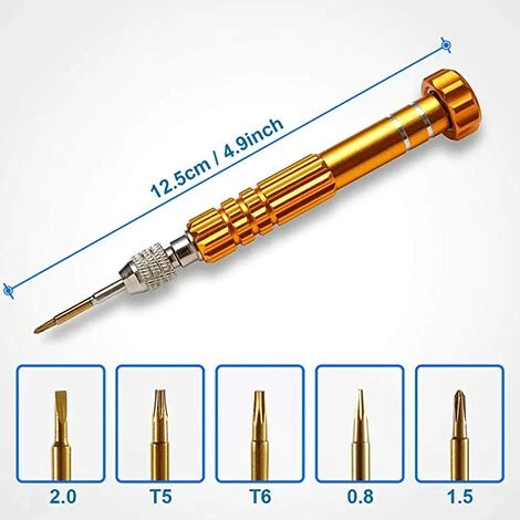 KOMPLETTES SET besteht aus starkem Aluminiumschaft und Bithalter, Pentalobe-Bit, Phillips-Bit, einem Y-Bit, einem Flachkopf-Bit und einem T5-Torx-Bit. Fach zur einfachen Aufbewahrung im Griff mit einer robusten Kappe, die sich für einen besseren Halt und höheren Bedienkomfort schließen und drehen lässt.
