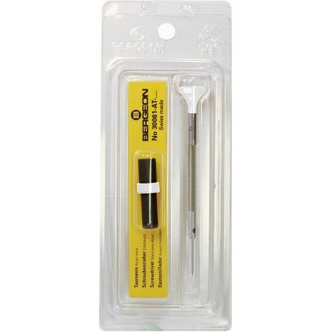 Ergnomischer Schraubendreher, komplett aus Inox (Schaft und Überzug), mit 2 Ersatzklingen in Kunststofftube.