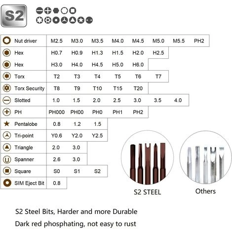 [Hochpräzise S2-Stahlbits]: S2-Stahlbits verfügen über eine hervorragende Verarbeitungstechnologie und Härtungsverarbeitung, und die Härte kann 60 HRC erreichen, was härter und haltbarer ist. Die Bits, die nach der Phosphatierung dunkelrot sind und nicht leicht zu rosten