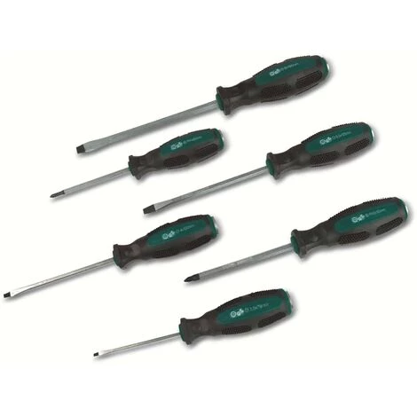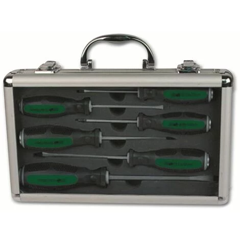 Schraubendreher-Set mit durchgehende Klingen aus Chrom-Vanadium Stahl und Schlagplatte. Features: – magnetische Spitzen – Aufbewahrungskoffer – Schlagplatte Lieferumfang: – Kreuzschraubendreher PH1x80 mm – Kreuzschraubendreher PH2x100 mm – Schlitzschraubendreher 3,5×75 mm – Schlitzschraubendreher 4×100 mm – Schlitzschraubendreher 6,5×125 mm – Schlitzschraubendreher 8×150 mm