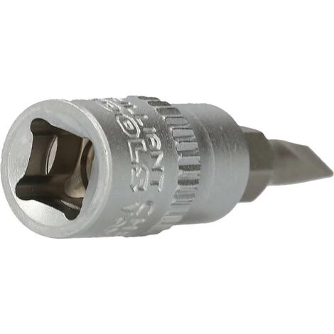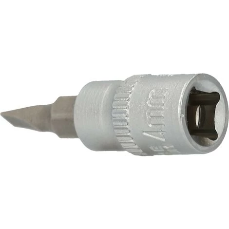 Die BRILLIANT TOOLS Bit-Stecknuss BT020810 hat einen 1/4″ (6,3 mm) Innenvierkant-Antrieb, der nach DIN 3120 gefertigt ist. Der eingepresste phosphatierte Bit mit Schlitz-Profil hat die Größe 0,8 x 4 mm. Die Bit-Stecknuss hat eine Gesamtlänge von 38 mm, die Klingenlänge beträgt 17 mm. Die Oberfläche ist an der Antriebsseite und an der Bitseite matt verchromt, diese ist durch eine Längsrändelung getrennt.