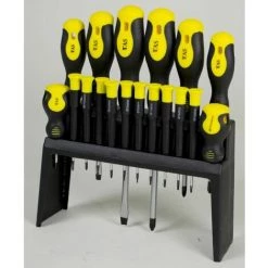 Dieses 18-teilige Schraubendreher-Set mit Gestell bietet eine große Auswahl an verschiedenen Schlitz-, Kreuz- und Torx-Schraubendrehern. Der rutschfeste Griff sorgt für eine ergonomische und sichere Handhabung während der Arbeitsabläufe. Die Kennzeichnung der Profilgröße und des Schraubensymbols am Griff verhindert ein langes Suchen und erleichtert das Arbeiten.6 Standard-Schraubendreher: