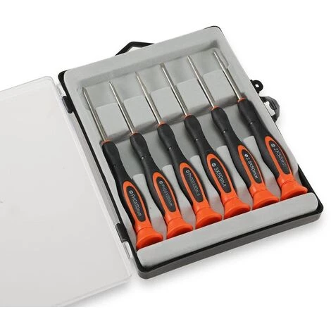 Hochwertiger Feinmechaniker Satz mit Chrom-Vanadium Klingen und frei drehender Handballenkappe für Bastler und Hobbyakteure. Gummierte Griffe für präzisen und rutschfeien Halt. Lieferumfang: – PH00 x 50mm – PH0 x 50mm – PH1 x 50mm – SL2 x 50mm – SL2,5 x 50mm – SL3 x 50mm – Kunststoff-Kassette