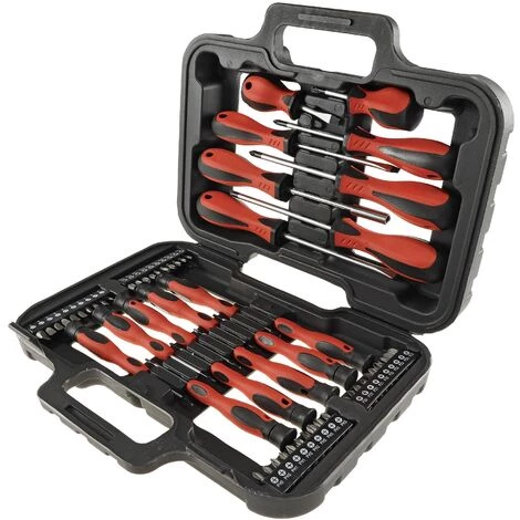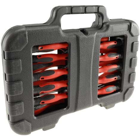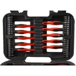 Der „All you need“ Heimwerker Koffer mit 58 Teilen. Robuste Schraubendreher mit gummierten Kraftgriffen bieten maximalen Halt bei der Arbeit. Gehärteter Chrome-Vanadium Werkzeugstahl für langfristige Haltbarkeit. Das Set beinhaltet in Summe 18 Schraubendreher in einer für Sie ausgesuchten Konfiguration, wie in Haushalten meist gebraucht. Lieferung in praktischem Transportkoffer.