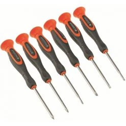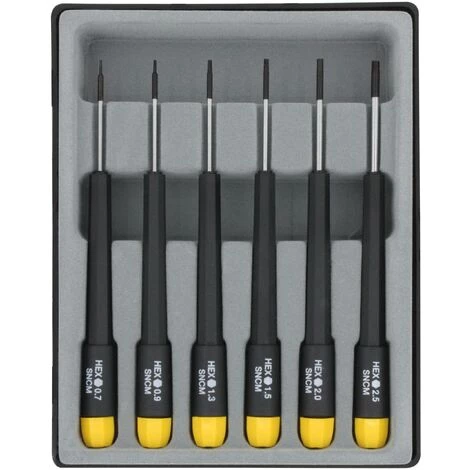 Hochwertige Präzisions-Schraubendreher mit gehärteten Spitzen aus Nickel-Chrom-Molybdän-Stahl mit schwarzen Spitzen und farbig drehbarer Kuppe für schnelles und leichtes Drehen (Zwirbeln). Griffe aus Polyamid (PA6). Sechskant 0,7 / 0,9 / 1,3 / 1,5 / 2,0 / 2,5 mm. Klingenlänge 40 mm.