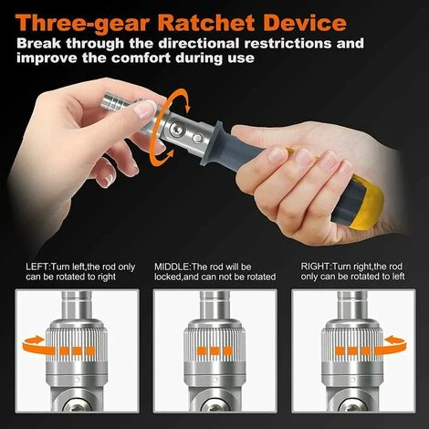 【Design mit drei Richtungen】Das Ratschendesign geht über die Grenzen der Richtung hinaus. Wenn Sie eine lange Schraube verwenden, müssen Sie nur die Ratsche drehen, um die Position im oder gegen den Uhrzeigersinn zu arretieren, und einfach abdrehen45° zum Anziehen der Schraube, das verbessert das Wohlbefinden und spart Kraftaufwand