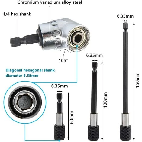 105-Grad-Magnetschraubendreher: 105-Grad-Winkelverlängerung, wo es verwendet wird, wenn es schwer zugängliche Stellen hat, 360-Grad-verstellbarer Daumenflansch, Handbohrer und Handschlüssel können angeschlossen werden an alle Bohrmaschinen und Rohrzangen.