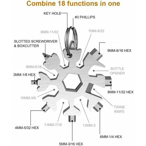 HOCHWERTIGE MATERIALIEN Das 18-in-1-Schneeflocke-Multifunktionswerkzeug ist aus Edelstahl gefertigt. Es hat eine polierte und korrosionsbeständige, abgerundete und haltbare Oberfläche, die exquisit verarbeitet und nicht leicht zu rosten ist. .< /p>