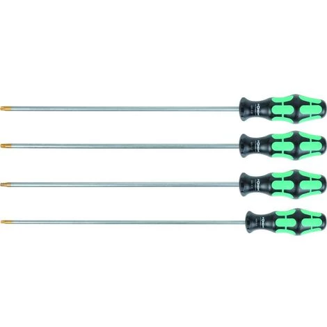TX Schraubendreher mit spezieller, starker Haltefunktion (ohne Magnetkraft) als 4-tlg. Satz in den Größen 20, 25, 27 und 30 extra lange Klingen (300 mm), um auch schwierige und/oder sehr tief gelegene Verschraubungen zu erreichen. durch die spezielle Haltefunktion ist das Herabfallen der Schrauben beim Ansetzen oder nach dem Lösen auf ein Minimum reduziert. dadurch sind z.?B. auch Arbeiten problemlos durchführbar, bei denen die Schraube aufgrund Platzmangels nicht festgehalten werden kann. die nutzbare Baulänge ist hervorragend geeignet, um z.?B. beim Entfernen von Kühlerabdeckungen oder Motorverkleidung bzw. Deckeln besser und ergonomischer an die Schrauben zu gelangen. ideal um Beschädigungen und Kratzer auf Lack, Kunststoff etc. zu vermeiden, die bei kurzen Baulängen oft durch den Griff entstehen. gängigste TX-Größen im Kfz-Bereich in einem Set. Anwendungsbeispiele: TX 20: Rücklichter Volvo V60 und V70, Mercedes-Benz Typ W168, W169 (A-Klasse), Typ W245 (B-Klasse) und Typ W203 (C-Klasse). TX 20?/?25?/?30: Alle Motorraumverschraubungen Audi A4 und A6, VW Passat. Bei allen drei Typen kann der lange TX auch zum Ausbau des Türschlosses vorne genutzt werden. TX 27: Motorraumverschraubungen Peugeot und Citroen. TX 30: Kotflügelverschraubungen BMW E46, speziell für Scheinwerfer Audi A4 und A6 ab Bj. 2006. Lkw: für Scheinwerfer Actros.