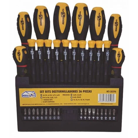 Mehrere Maßnahmen -Set Schraubendreher Bit-Einsätze 36 Pcs + Wandhalterung. -Mehrere Maßnahmen. -Destornilladores (-): 8×150, 6×100, 5×75, 6×38. -Destornilladores (+): PH 2×100, 2×38, 1×75. 1 Mango Bits 18 Bits + Sortimente. -Destornilladores Präzision ¢ n (-): 3×40, 2.5×40