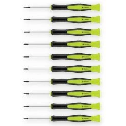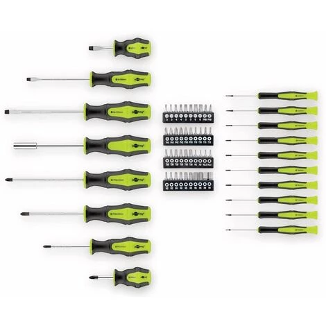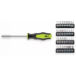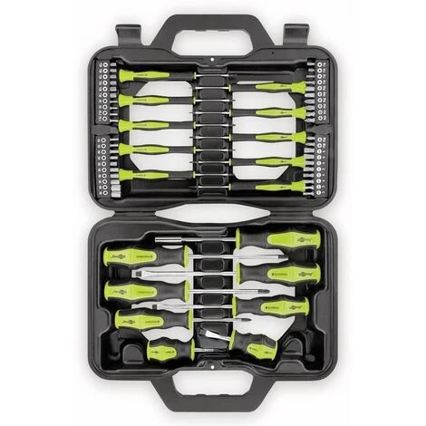Vielseitiges Schraubendreher-/Bit-Set für fast alle Schraub- und Montagearbeiten bei Hobby und Beruf. Alle Teile aus Chrom-Vanadium mit magnetischen Spitzen. Die Lieferung erfolgt im praktischen Koffer. Features: – aus Chrom-Vanadium-Stahl (CRV) mit erhöhter Verformungsfestigkeit – magnetische Spitzen für sichere Drehmomentübertragung und schnelles Fixieren – ergonomische Griffe für einen angenehm festen Halt beim Arbeiten – Rutschfestigkeit durch gummierten Schaft – Präzisions- Schraubendreher mit frei drehendende Handballenkappen für leichtes drehen Lieferumfang: – 3x Schlitz-Schraubendreher: 6×125 mm, 5×100 mm, 6×38 mm – 4x Kreuzschlitz-Schraubendreher: PH2x125 mm, PH2x100 mm,PH1x75 mm, PH2x38 mm. – 2x Präzisionsschlitzschraubendreher: 2,5×50 mm, 2×50 mm – 2x Präzisionskreuzschraubendreher: PH2.5×50 mm, 2×50 mm – 6x Präzisionsinnensternschraubendreher: T5, T6, T7, T8, T9, T10x50 mm – 40 Bits: – 8x Schlitz: 3 mm, 3 mm, 4 mm, 4 mm, 5 mm, 5 mm, 6 mm, 6 mm – 8x Kreuzschlitz: PH0, PH0, PH1, PH1, PH2, PH2, PH3, PH3 – 10x Innenstern: T10, T10, T15, T15, T20, T20, T25, T25, T30, T30 -14x Außensechskant: H2, H2, H2.5, H2.5, H3, H3, H4, H4, H5, H5, H6 ,H6, H8, H8 – Koffer