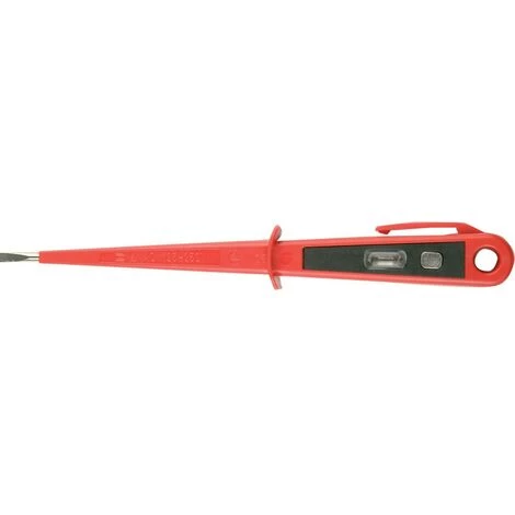 Mit umlaufendem Handschutz. Clip aus isoliertem Material. Anzeigesystem sicher und fest im Handgriff des Prüfers eingebaut.