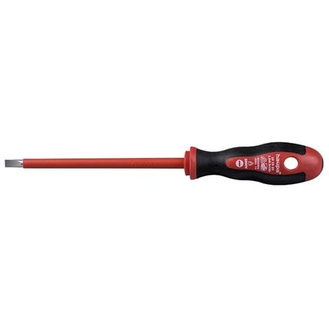 Elektriker-Schraubendreher Schlitzmit 2-Komponenten-Heft aus PP/TPE-Material. Klinge aus Molybdän-Vanadium-Stahl. gehärtet. gestrahlt. stückgeprüft