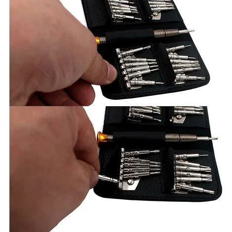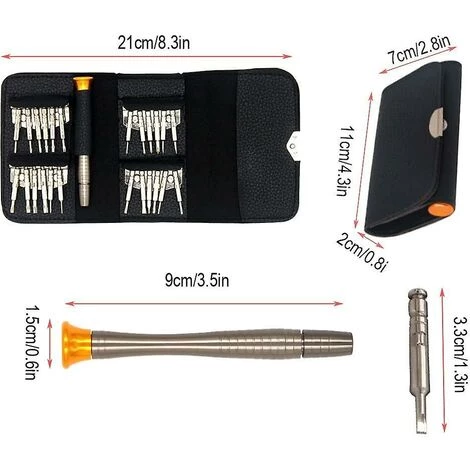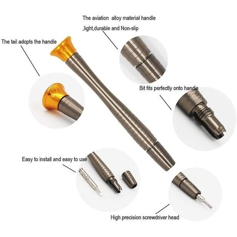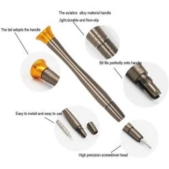 4,3 Zoll langer Griff aus Aluminiumlegierung mit 1,2 Zoll langen Schraubendreherbits aus Chrom-Vanadium-Stahl.