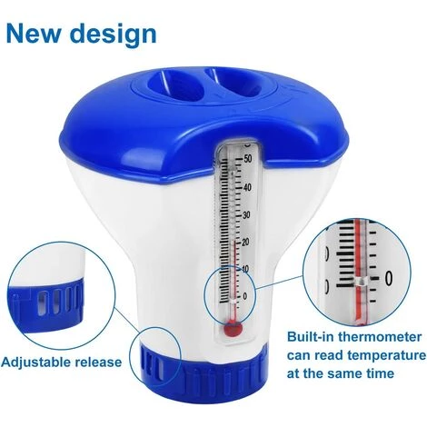 【HOHE QUALITÄT & EINZIGARTIGES DESIGN】: Der schwimmende Chlorspender besteht aus hochwertigem PP-Material, das langlebig und beständig gegen Stürze/Oxidation/Korrosion ist. Das eingebaute Thermometer kann gleichzeitig die Temperatur ablesen und die Temperatur testen Der Bereich ist: 30°F-120°F / 0°C-50°C.