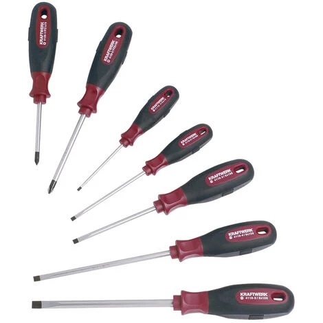 Kraftwerk 4161 Ergokraft Schraubendreher-Satz PZ 7-teilig. Bestehend aus 5 Schlitzschraubendreher und 2 Pozidriv® Kreuzschlitz-Schraubendreher. Die Schraubendreher verfügen über einen ergonomischen 2-Komponenten-Handgriff und liegen gut in er Hand. Die durchgehende Klinge ist aus gehärtetem S2-Stahl für eine lange Lebensdauer.