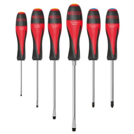 : Satz mit 6 Schraubendrehern Ergonomische Handhabung Optimale bertragung des Anzugsdrehmoments Schraubendreher mit Griff, beständig gegen Kohlenwasserstoffe und Chemikalien Ergonomisches und widerstandsfähiges Dreistoff-Griffdesign, widerstandsfähig und schlagfest SVCM Stahlklinge Merkmale: 4 Flachschraubendreher : 3,5 – 4,0 – 5,5 – 5,5 – 6,5 mm 2 Pozidriv-Schraubendreher : PZ1 – PZ2 Verpackung: 1x KS TOOLS Ultimate Schraubendreher-Set – 6-teilig – 922.6040 Lieferung in der Originalverpackung