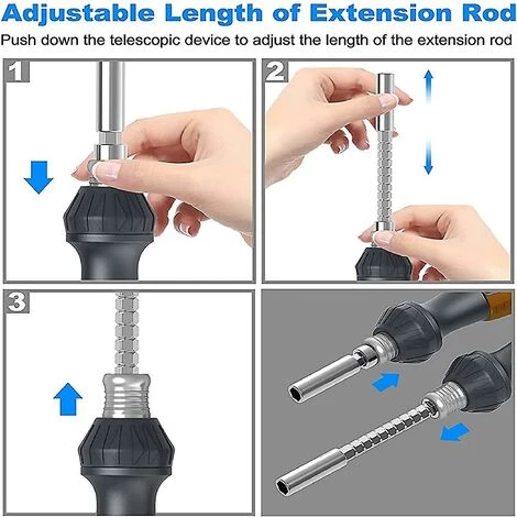 WISSENSCHAFTLICHES DESIGN: Der Schraubendreher kann die Verlängerungsstange einstellen, und der eingebaute starke Magnet kann den langen oder kurzen Bit fest aufnehmen. Machen Sie die Demontage und Installation einfacher, wirtschaftlicher und bequemer. .