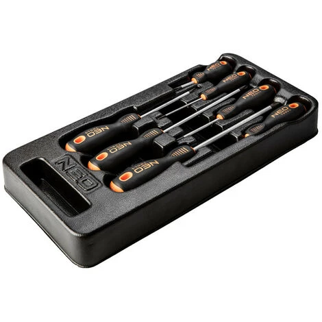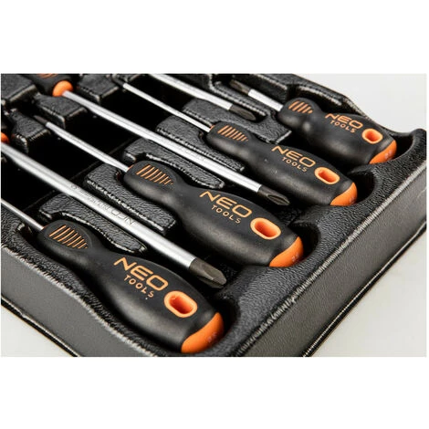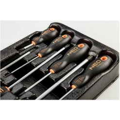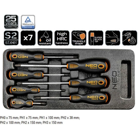 Die Spitze der Schraubendreher besteht aus extrem haltbarem S2-Stahl. Die Arbeitsspitzen der Spitze wurden wärmebehandelt, wodurch die entsprechende Härte und Biegefestigkeit von 56 HRC erreicht wurde. Die Schraubendreher haben magnetische, verstärkte Spitzen. Die dreieckige Form des Griffs mit einer konturierten Daumenauflage reduziert die Belastung der Hand während der Arbeit und hilft, das optimale Drehmoment zu erzielen. Der Zwei-Material-Griff verhindert ein Verrutschen in der Hand und ist beständig gegen Chemikalien, Öle und Fette. Die Werkzeuge werden in einem praktischen Kunststoffformteil geliefert, das zu den Schubladen der Werkzeugschränke NEO 84-221 und 84-222 passt. Die Qualität des Werkzeugs wird durch die 25-jährige Herstellergarantie bestätigt. Die Marke NEO erfüllt die Erwartungen von Profis.