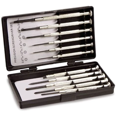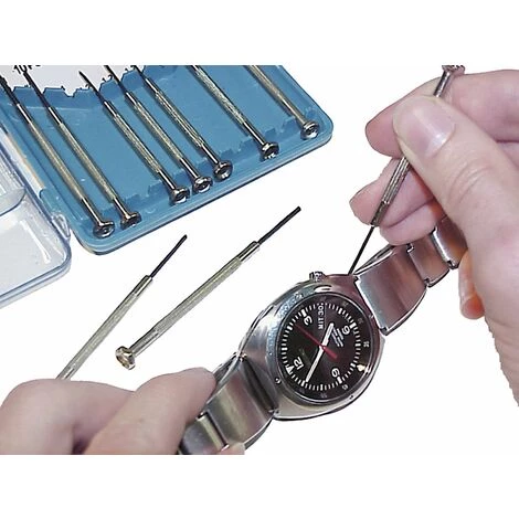 Inhalt: 6 Längsschlitz-Schraubendreher mit Klingenbreiten von 0,9…3 mm, 3 Kreuzschlitz-Schraubendreher mit den Größen 00/0/1 und ein Magnet.