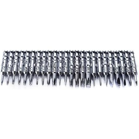24: 4 Schlitz – 5 Kreuzschlitz, 2 Pentakel, 10 mit Drehmoment herausnehmbare Einsätze, 1 Tri-Wing-Aufsatz, 1 Dreieck, 1 Rund