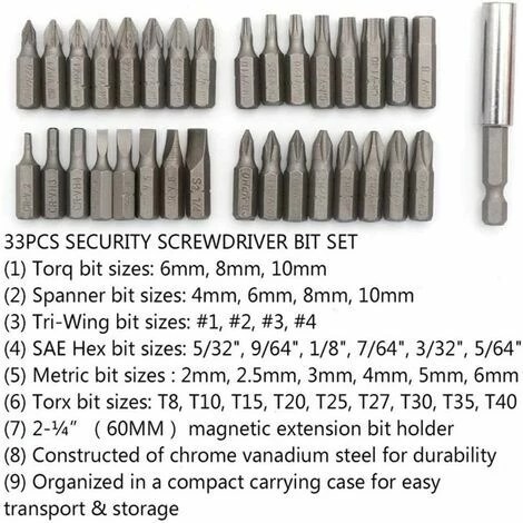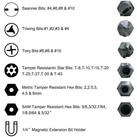 Paket enthalten: Dieses Set enthält 2 x 2″ magnetische Bithalter und 4 x Tri-Wing-Bits, 6 x SAE-Sechskant-Bits, 3 x Torq-Bits, 4 x Schraubenschlüssel-Bits, 6 x metrische Bits und 9 x Torx-Bits.