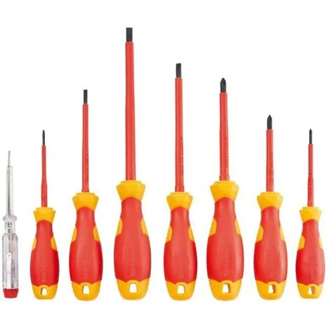 - Nach DIN isolierte Klingen – für sicheres Arbeiten an spannungsführenden Teilen bis 1000 Volt Aus hochwertigem Chrom-Vanadium-Stahl Rutschhemmende Weichzonengriffe mit Abrollschutz für komfortables Arbeiten Mit praktischem Aufhängeloch und Schraubenkennzeichnung am Griffende 4 x Schlitzschraubendreher 3 x Kreuzschlitzschraubendreher 1 x Spannungsprüfer (125-250 V) mit Metallclip (DIN VDE 0680 Teil6:1977-04)