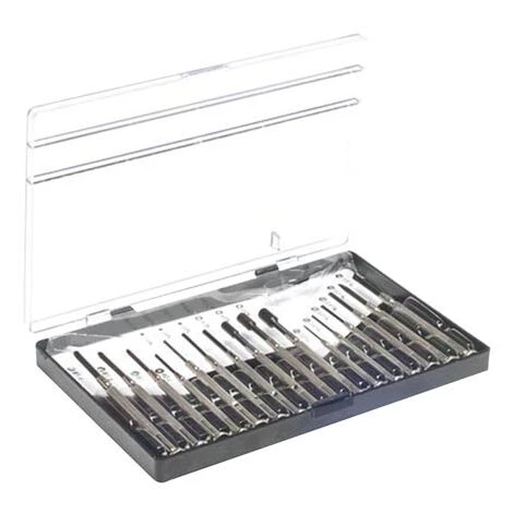 6 x Schlitz: 1-1.4-2-2.4-3-3.8 mm, 3 x Stern: 1.5-2-2.5 mm, 4 x Kreuzschlitz: PH000-PH00-PH0-PH1, 3 x Steckschlüssel: sockets 3-4-5 mm
