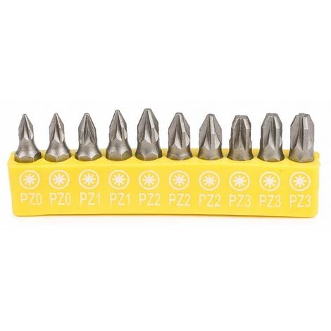 - Bit-Aufsatz in 10x Schlitz (3, 4, 4, 5, 5, 6, 6, 6, 6, 8); 20x Kreuz (2xPH0, 2xPH1, 3xPH2, 3xPH3) und (2xPZ0, 2xPZ1, 3xPZ2, 3xPZ3) und 10x TORX (T10, T15, T20, T25, T25, T27, T30, T35, T40)