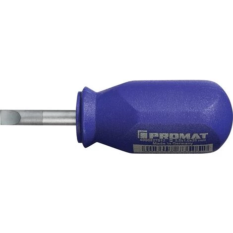 Schraubendreher Schneiden-B.6mm Klingen-L.25mm 1K-Griff Rundkl.PROMAT kurze Form · 1-Komponentengriff · Klinge aus vergütetem Spezialstahl · matt verchromt für Schlitzschrauben Weitere technische Eigenschaften: · Material: hochvergüteter Spezialstahl