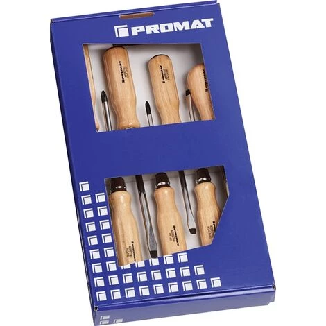 Schraubendrehersatz 7-tlg.Schlitz/PH/Aufreiber Holzgr. Rundklinge m.6-Kt-Ansatz mit Holzgriffen · durchgehende Klingen aus vergütetem Spezialstahl mit Schlüsselhilfe · glanzverchromt · mit Lederkappen · inkl. Aufreiber · Schneiden/Spitzen der Schraubendreher brüniert Weitere technische Eigenschaften: · Verpackung: im Karton Inhalt: je 1 Schraubendreher für Schlitzschrauben , 4,5 x 90 / 5,5 x 100 / 7,0 x 125 / 9,0 x 150 mm je 1 Schraubendreher für Schrauben mit Kreuzschlitz (PH), Gr. 1 x 80 / 2 x 100 mm 1 Aufreiber 6 x 100 mm