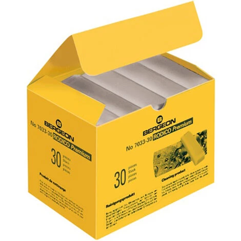 Zum Reinigen von Zapfen, Rädern usw, zum Entfernen von Fingerabdrücken auf Platinen, Zifferblättern, Zeigern usw. und zum Entfernen von überflüssigem Öl auf Steinen.Verbesserte Ausführung des seit Jahrzenhnten bekannten Rodico grün. Die neue graue Reinigungsmasse ist weicher als das bekannte grüne Produkt und ist aufnahmefähiger für Öle und Schmutzpartikel.
