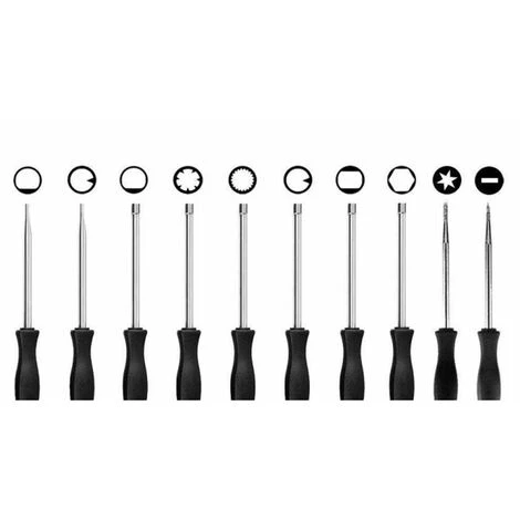 - 10 verschiedene Vergaser-Einstellwerkzeuge, die Ihre 2-Takt-Motoren bei guter Leistung halten, einschließlich Pac Man, Small Head Pac Man, Single D, Small Head Single D, Double D, Hexagon, 21 Zähne Splined (aufgerüstet von 7 Zähne Splined) usw., verwendet für die meisten 2-Takt-Vergasermotoren. Unentbehrlich für diejenigen, die persönliche Ausrüstung und Sachen für Freunde und Familie warten.