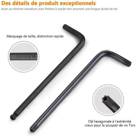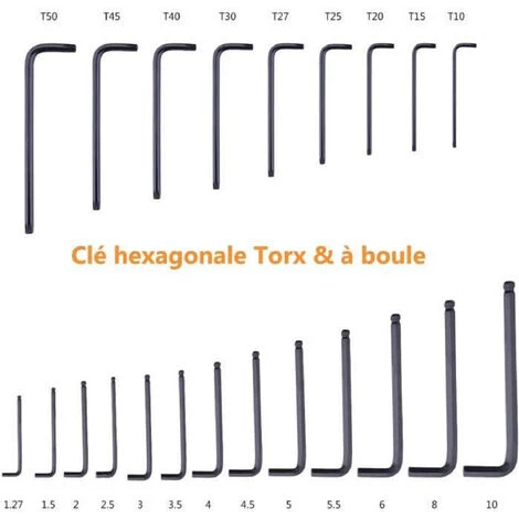 22 Kugelkopf-Torx-Innensechskantschlüssel: 13 Kugelkopf-Sechskantschlüssel (metrisch): 3,5 mm 1,27 mm | 1,5mm | 2mm | 2,5mm | 3mm | 4 Millimeter | 4,5mm | 5mm | 5,5mm | 7mm | 8mm | 10 mm.9 Sechskantschlüssel mit Torx-Kopf: T10 | T15 | T20 | T25 | T27 | T30 | T40 | T45 | T50.