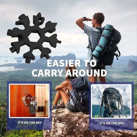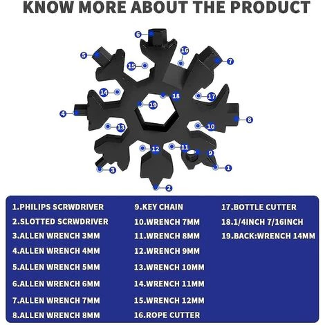 1,18-in-1-Snowflake-Multitool: Kreuzschlitzschraubendreher, Schlitzschraubendreher, Inbusschlüssel: Metrisch (Millimeter) – 3-4-5-6-7-8, Schlüsselloch, Außensechskantschlüssel: Metrisch (Millimeter) -7-8-9-10-11-12-14, Seilschneider, Flaschenöffner, Kartonschneider.2.Mehrfachverwendung: Dieses 18-in-1-Multitool kann verwendet werden, um das Snowboard zu reparieren, die Schraube zu drehen und das Bier zu öffnen Flasche, Reparaturfahrrad und Spielzeug. Es kann auch für Outdoor-Aktivitäten wie Camping, Wandern, Rettung und mehr verwendet werden. Dieses Schneeflocken-Multitool ist eine einfache und optimierte Version von massiven Multitool-Kits. Eine innovative, zuverlässige und einzigartige Möglichkeit, sich jedem Abenteuer direkt zu stellen. 3. Edelstahl-Multitool: Das 18-in-1-Schneeflocken-Multitool besteht aus korrosionsbeständigem Edelstahl, einzigartigem Schneeflockenmuster, polierten Oberflächen, geglättet, Exquisite Verarbeitung, robust und langlebig, verschleißfeste Technologie, nicht leicht zu rosten, zu biegen oder stumpf zu machen Ring zum einfachen Aufhängen am Schlüssel oder Camping-/Reiserucksack. Seien Sie immer bereit für Ihren täglichen Gebrauch und Ihre Abenteuer. 5. Tolles Weihnachtsgeschenk Das einzigartige schneeflockenförmige und praktische Design des 18-in-1-Schneeflocken-Multifunktionswerkzeugs ist das perfekte Geschenk für Ihren Vater, Ehemann oder Freund zu Weihnachten, Geburtstag oder Valentinstag , oder jede andere Gelegenheit.