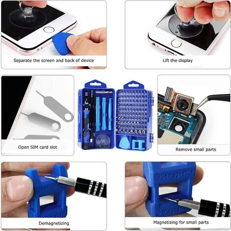 【122 in 1 Mehrfach-Schraubendreher-Kits】 Das magnetische Schraubendreher-Kit enthält in der Tasche mit kompaktem integriertem Design, hält alle Dinge ordentlich und organisiert, tragbar und bequem. Einfach zu tragen oder zu lagern. Ebenfalls enthalten sind ein magnetischer Treibergriff, eine antistatische Handschlaufe, eine antistatische Pinzette, eine ABS-Demontagestange, ein Allzweckmesser, ein SIM-Auswurfstift, ein LCD-Saugnapf, ein dreieckiger Schlitz, ein Reinigungstuch und ein A-Lineal.