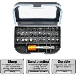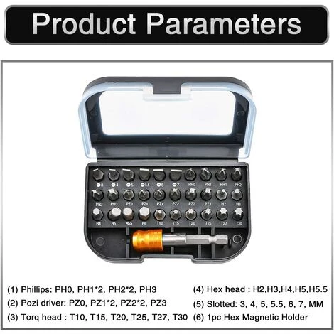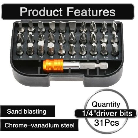 30 x am häufigsten verwendete Schraubendreher-Bits (6 Stück je Philips, Schlitz, Torx, Sechskant, Pozi) mit 1 x Schnellspanner-Sechskant-Verlängerungsadapter für die meisten Schrauben im täglichen Leben.