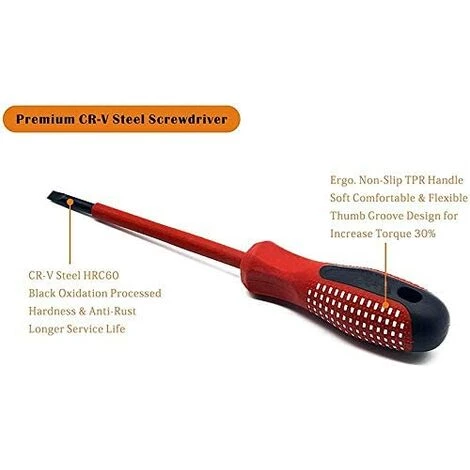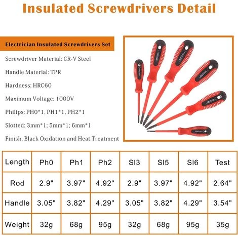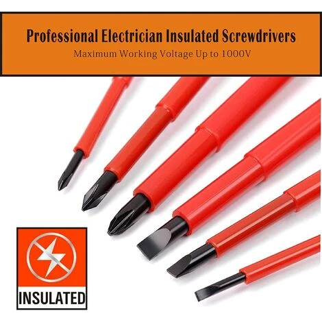 Kit für isolierte elektrische Schraubendreher: 3 Kreuzschlitzschraubendreher (PH0 x 1 PH1 x PH2 x 1) 3 flache Schraubendreher (3 mm x 1,5 mm x 1,6 mm x 1) 1 Elektrosonde mit einer Nylon-Aufbewahrungstasche. /p>< p>Isolierter Premium-Schraubendreher: Hergestellt aus hochwertigem CR-V mit hoher Härte (HRC60), übertrifft den Härtestandard für eine längere Lebensdauer deutlich.