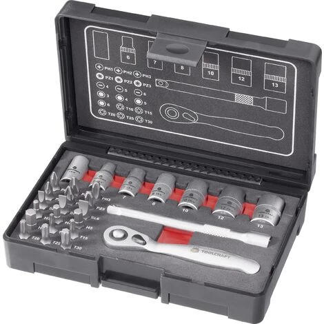 Beschreibung: TOOLCRAFT Steckschlüsselsatz metrisch 1/4″ (6.3 mm) 26teilig 819263