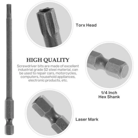 S2-Legierter Stahl – Zäh und verschleißfest – 11 Torx-Bits 100 mm lang 1/4 ist erstklassiger S2-Stahl, 6,35 mm Sechskant, der schlagfest und zäh ist, sehr verschleißfest.