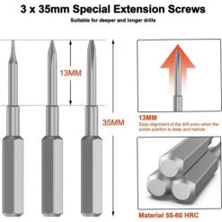 3 spezielle 35-mm-Verlängerungsschrauben: Das professionelle Verlängerungsschrauben-Kit (PH000, Y000, P2) wurde mit einem größeren Arbeitstiefe des Bohrers, so dass der Bohrer auch bei tiefen und engen Schraubenpositionen leicht ausgerichtet werden kann. Geeignet für tiefere und längere Bohrer, nur zur Verwendung mit einer Handbohrmaschine mit niedriger Drehzahl während des Gebrauchs, nicht für die Verwendung mit elektrischen Schnellbohrmaschinen geeignet.