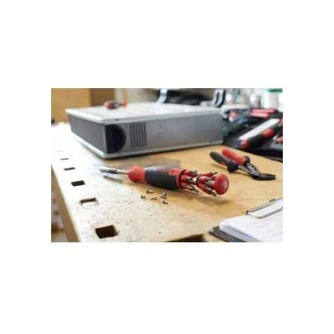 Vereinfacht Ihre Arbeit: Großer Griff – Maximale Power.Senkt Ihre Kosten: 26 Werkzeuge in Einem.Spart Zeit: Nie mehr suchen – Die gängigsten Bits in einem Werkzeug.Steigert Ihre Effizienz: 90% weniger Volumen, 85% weniger Gewicht – 100% Effizienz.Anwendung: Die Alternative zum Schraubendrehersatz.Der Magazin-Bithalter Liftup 26one präsentiert sich mit 13 Doppelbits; 12 im Magazin und 1 Doppelbit im Bithalter. Im Inneren des Bithalters befindet sich der zweireihige Bit-Clip in Fächer-Prinzip, welcher eine einfache Bitentnahme ermöglicht. Mit seiner schlanken Form ermöglicht der Superslim Bithalter, dass auch Schrauben z.B. in Sacklöchern noch ereicht werden können, wenn andere dickere Bithalter bereits scheitern. Die ausgefeilten Detaillösungen des LiftUps wissen voll zu überzeugen – von der Vielseitigkeit ganz zu Schweigen. So fährt das Bit-Magazin am Griffende auf Knopfdruck heraus und gibt die Bits zur Entnahme frei. Die Soft-Zone des ergonomisch geformten SoftFinish Mehrkomponentengriffs besteht aus hautsympathischem Spezialmaterial. Sie sorgt in Verbindung mit der handschonenden Geometrie und dem großen Volumen des Griffs für höchste Drehmomentwerte. Kraftvolles Eindrehen oder Lösen von Schrauben geht damit besonders leicht von der Hand.Werkzeug ist ausschließlich mit den Wiha Doppelbits kompatibel.Inhalt:1x Doppelbit, Schlitz/Schlitz 5,5/6,51x Doppelbit, Schlitz/Schlitz 4,0/6,01x Doppelbit, Phillips/Phillips PH0/PH31x Doppelbit, Phillips/Phillips PH1/PH21x Doppelbit, TORX/TORX T6/T81x Doppelbit, TORX/TORX T10/T151x Doppelbit, TORX/TORX T20/T25 1x Doppelbit, TORX/TORX T27/T301x Doppelbit, Pozidriv/Pozidriv PZ1/PZ21x Doppelbit, Pozidriv/Pozidriv PZ0/PZ31x Doppelbit, Innensechskant/Innensechskant 3.0/4.01x Doppelbit, Innensechskant/Innensechskant 5.0/6.01x Doppelbit, Innenvierkant/Innenvierkant #1/#2 | Eigenschaften: Gewicht: 358, Anzahl der Teile: 13, VDE-geprüft: Nein, ESD-geprüft: Nein