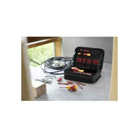 Vereinfacht Ihre Arbeit: Alle Werkzeuge sicher und geordnet in einer robusten und übersichtlichen Tasche untergebracht.Steigert Ihre Effizienz: Platzeinsparung durch umfangreiches Wechselbitsystem und wechselbare Steckschlüsseleinsätze.Schützt Ihr Material: Vollisolierte Steckschlüssel reduzieren die Gefahr von Kurzschlüssen.Bietet Ihnen vollen Schutz: Jedes Werkzeug einzeln bei 10.000 V AC getestet und zugelassen für 1.000 V AC.Erhöht Ihre Sicherheit: Wiha slimBits gewährleisten einen guten und geschützten Zugang zu tief liegenden Schrauben.Anwendung: Für Arbeiten im Bereich von spannungsführenden Teilen bis 1.000 V AC. Ideal für den mobilen Einsatz und im beengten Arbeitsumfeld.Bithalter: Isolierter Bithalter aus Metall hält alle slimBits zuverlässig.Bithalter: Nur für 6 mm slimBits.Bei Arbeiten an unterschiedlichen Einsatzorten wie z.B. auf Baustellen, an Solaranlagen und in Schaltschränken werden viele verschiedene Schraubprofile benötigt. Das 32-tlg. Set deckt alle gängigen Schraubprofile ab und ist somit flexibel einsetzbar. Sicher verstaut und geordnet in einer robusten Funktionstasche sind die Elektriker-Werkzeuge perfekt für den mobilen Einsatz geeignet. Als Träger eines Design-Awards begeistert die Tasche von Wiha neben dem patentierten Design, auch durch multifunktionale Einsetzbarkeit. Ein weiterer Pluspunkt ist die multifunktionale Einsetzbarkeit der Tasche. In aufgeklapptem Zustand fungiert sie als Werkbankständer zur leichten Entnahme der Werkzeuge. Die Lasche zum Aufhängen an der Wand sowie der herausnehmbare Einlegeboden schaffen einen zusätzlichen Mehrwert. Das Werkzeugset bietet eine optimale Platzeinsparung durch ein umfangreiches Wechselbitsystem. Dank der Wiha slimTechnology können die enthaltenen slimBits mit ihrer bis zu 33% schlankeren Klingen auch tiefliegende Schraub- und Federelemente mühelos erreichen. In Kombination mit dem extra kurzen Stubby-Griff können die Schrauben insbesondere an Engstellen mühelos erreicht werden. Für feine und filigrane Verschraubungen ist der PicoFinish Handgriff ideal geeignet. Der große SoftFinish Längsgriff kommt zum Einsatz, wenn in Kombination mit den größeren slimBits Profilen beim Verschrauben mehr Kraft aufgebracht werden muss. Jedes Werkzeug im Set wurde gemäß der internationalen Norm IEC 60900 einer Stückprüfung unterzogen und ermöglicht ein sicheres Arbeiten im Bereich von spannungsführenden Teilen bis 1.000 V AC.Die 6 mm slimBits und Steckschlüsseleinsätze sind nur im speedE, slimVario oder TorqueVario-S electric Werkzeugen zu verwenden.Geprüft gemäß IEC 60900.Inhalt:1x Bit slimBit electric Schlitz 2,0 mm x 75 mm (43115)1x Bit slimBit electric Schlitz 3,5 mm x 75 mm (41159)1x Bit slimBit electric Schlitz 5,5 mm x 75 mm (34581)1x Bit slimBit electric Schlitz 6,5 mm x 75 mm (34582)1x Bit slimBit electric Phillips PH0 x 75 mm (43116)1x Bit slimBit electric Phillips PH1 x 75 mm (34583)1x Bit slimBit electric Phillips PH2 x 75 mm (34584)1x Bit slimBit electric PlusMinus/Pozidriv SL/PZ1 x 75 mm (34589)1x Bit slimBit electric PlusMinus/Pozidriv SL/PZ2 x 75 mm (34590)1x Bit slimBit electric Pozidriv PZ1 x 75 mm (34585)1x Bit slimBit electric Pozidriv PZ2 x 75 mm (34586)1x Bit slimBit electric Sechskant 3,0 mm x 75 mm (37147)1x Bit slimBit electric Sechskant 4,0 mm x 75 mm (37225)1x Bit slimBit electric Sechskant 5,0 mm x 75 mm (37226)1x Bit slimBit electric TORX T10 x 75 mm (35507)1x Bit slimBit electric TORX T15 x 75 mm (35508)1x Bit slimBit electric TORX T20 x 75 mm (35509)1x Bit slimBit electric TORX T25 x 75 mm (36071)1x Steckschlüsseleinsatz isoliert 1/4 Außensechskant 5,0 mm (43089)1x Steckschlüsseleinsatz isoliert 1/4 Außensechskant 5,5 mm (43090)1x Steckschlüsseleinsatz isoliert 1/4 Außensechskant 6,0 mm (43091)1x Steckschlüsseleinsatz isoliert 1/4 Außensechskant 7,0 mm (43092)1x Steckschlüsseleinsatz isoliert 1/4 Außensechskant 8,0 mm (43093)1x Steckschlüsseleinsatz isoliert 1/4 Außensechskant 10,0 mm (43095)1x Steckschlüsseleinsatz isoliert 1/4 Außensechskant 11,0 mm (43096)1x Steckschlüsseleinsatz isoliert 1/4 Außensechskant 13,0 mm (43098)1x Adapter slimVario electric für 1/4 Steckschlüssel 6,0 mm (43139)1x Verlängerung slimVario electric für slimBits 6,0 mm (43292)1x Schraubendreher mit Bithalter SoftFinish slimVario electric1x Feinschraubendreher PicoFinish slimVario electric1x Schraubendreher mit Bithalter SoftFinish electric slimVario Stubby1x Funktionstasche | Eigenschaften: Gewicht: 1 g, Serie: 7209N, VDE geprüft: Ja, Anzahl der Teile: 31, rollbar: Nein, VDE-geprüft: Ja, Anwendung: Elektro, Anzahl Teile: 31