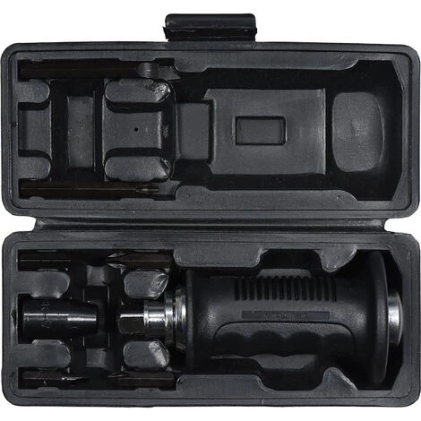 Der Schlagschraubenzieher findet seinen Einsatz in Werkstatt und Hobby. Zum Lieferumfang gehört neben den 6 Bits auch eine praktische Aufbewahrungsbox aus Kunststoff.